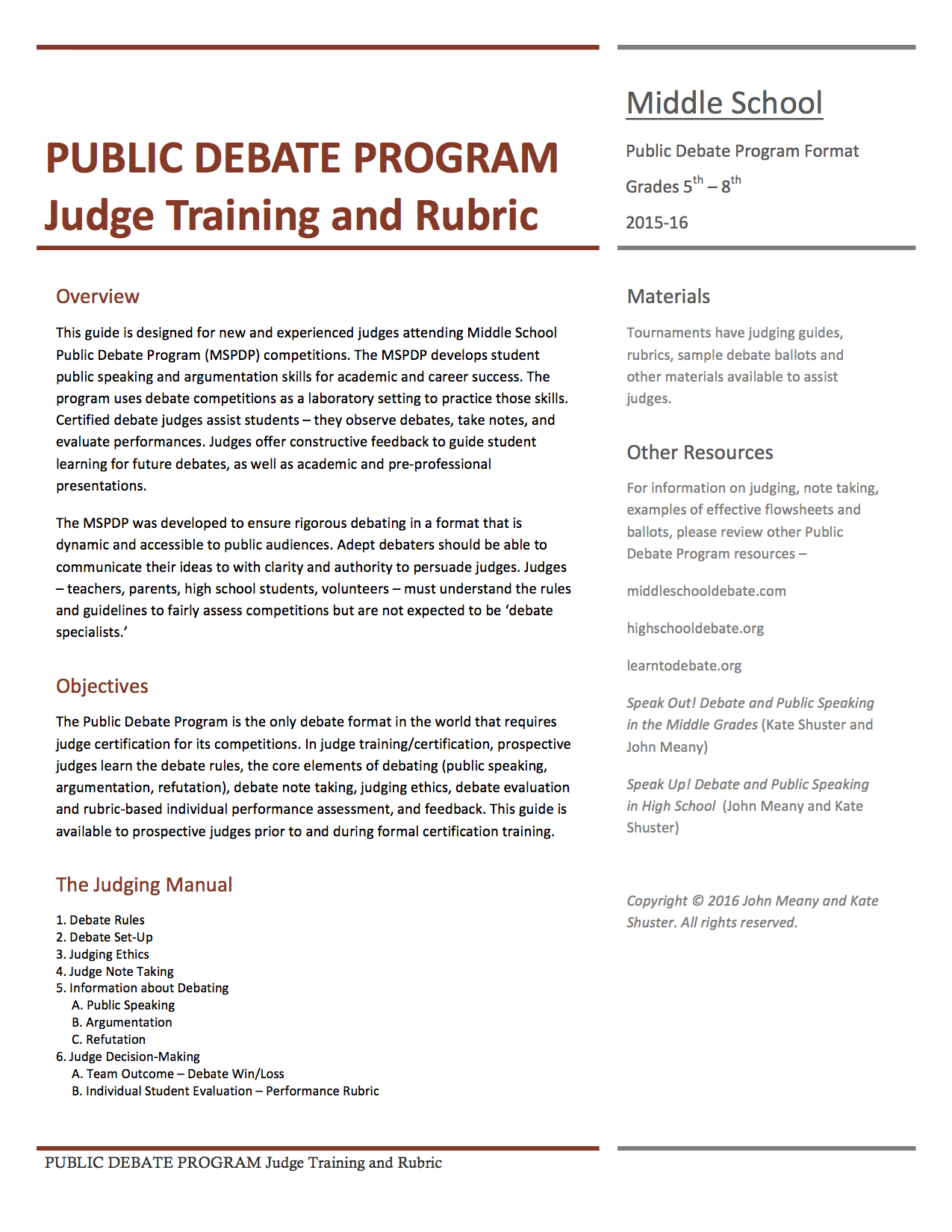 There are supplementary resources in the Speak Up! textbook. The updated Public Debate Program website (forthcoming Spring 2019) will include additional judging materials. Leagues may supplement judge training but may not alter the core elements of training and student evaluation without the permission o the PDP, which are designed to maximize student learning, based on age-appropriate educational standards and professional communication best practices.