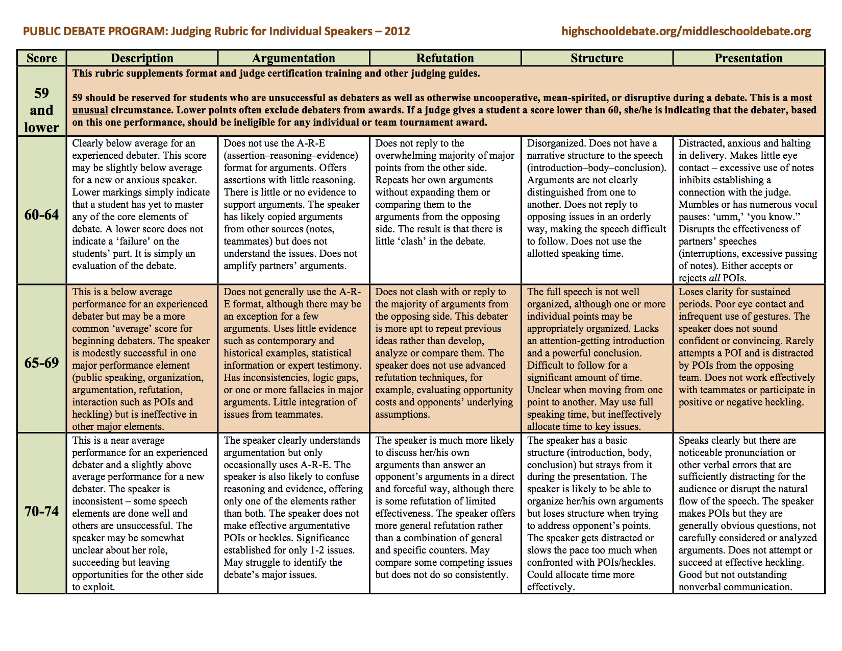 For individual student performances, the MSPDP/HSPDP use a unified rubric (assessment device for middle school and high school students). This is the PDP debate evaluation rubric.